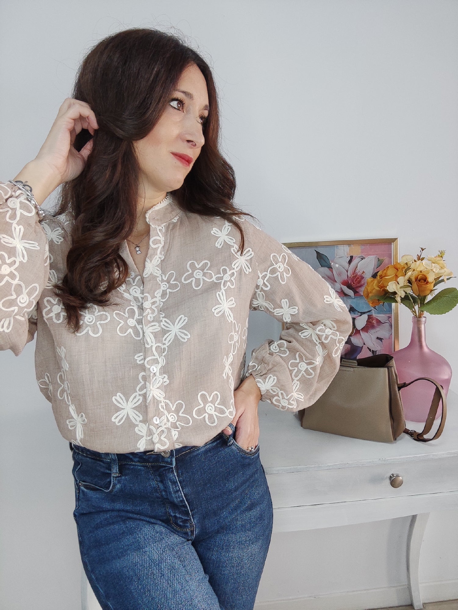 Camisa en color taupe con diseño en relieve con forma de flor en hilo blanco.