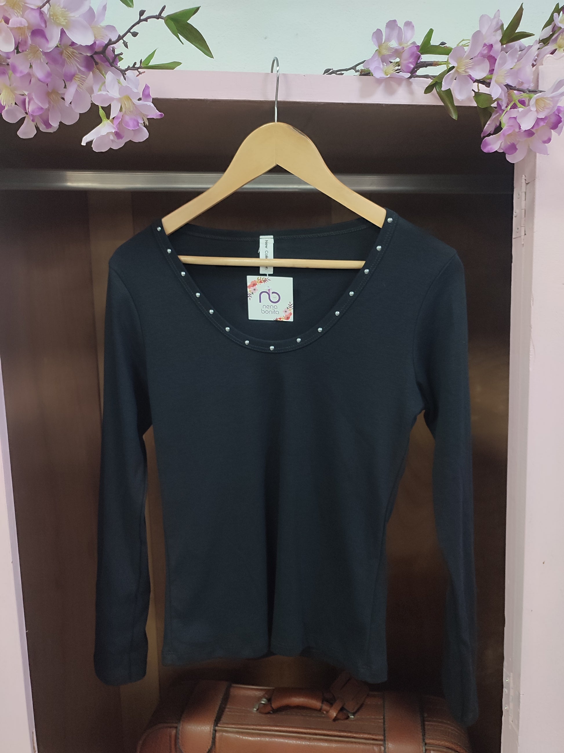Camiseta básica de algodón con tachas. Las tachas en plateado y la camiseta es tejido 100% algodón diseñada en talla única (36/40)