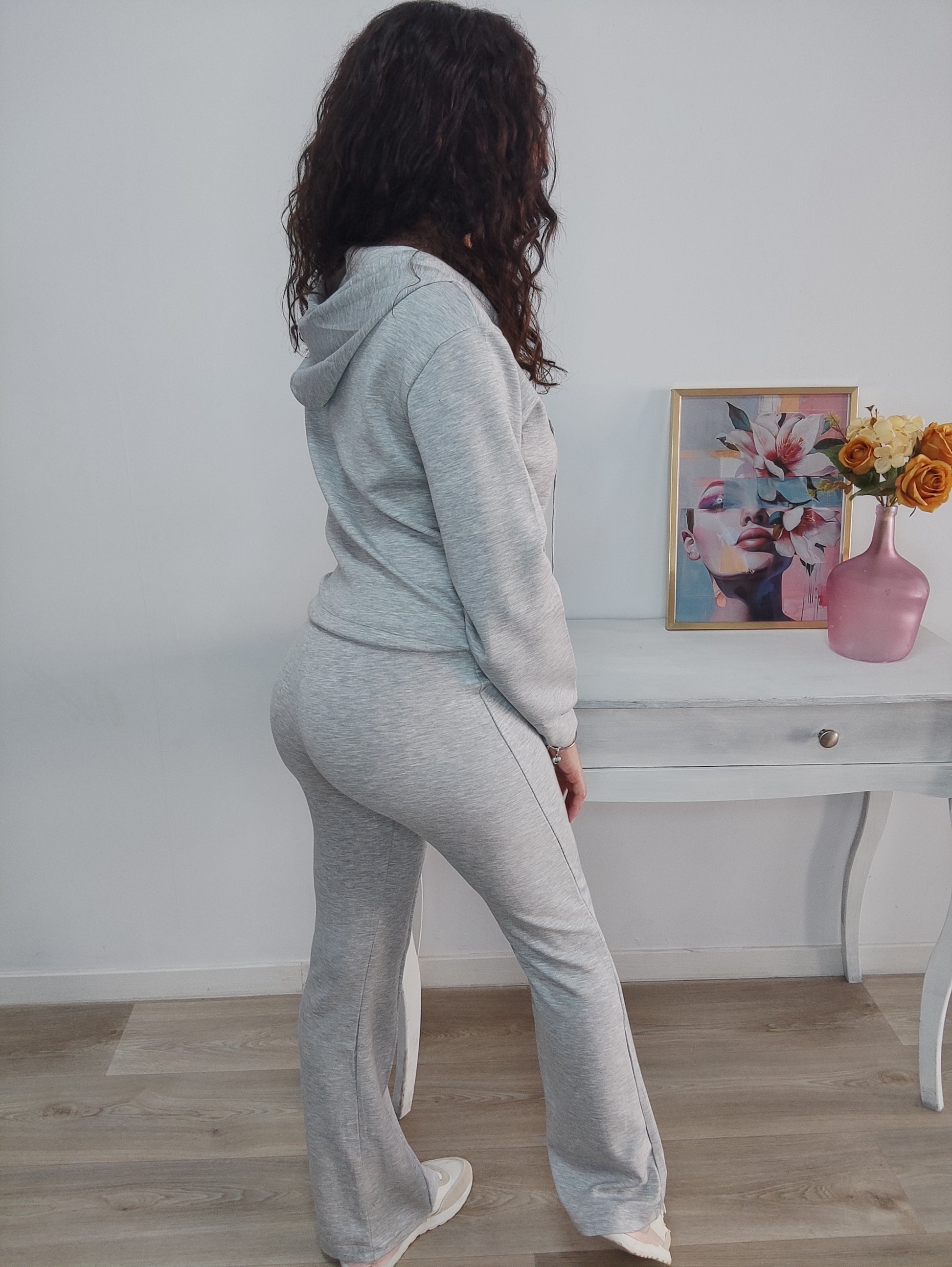 Conjunto de sudadera y pantalón. La sudadera lleva cremallera y capucha. El pantalón es de corte flare.