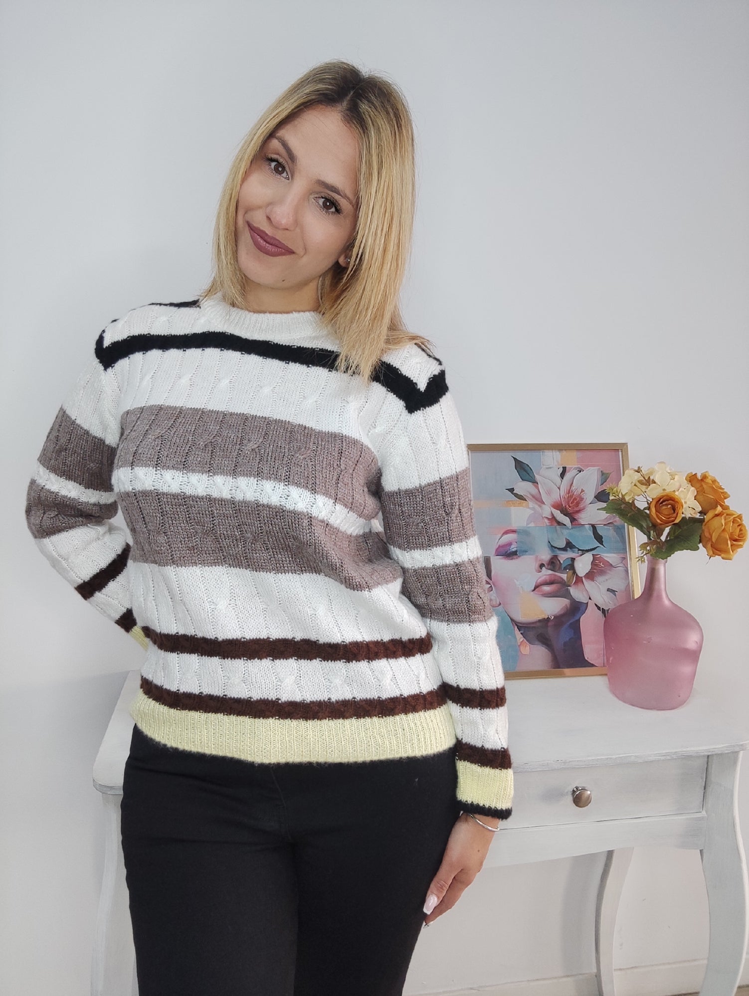 Jersey calentito y suave con rayas en tonos negro, topo y amarillo. Luce bella con este bonito diseño.
