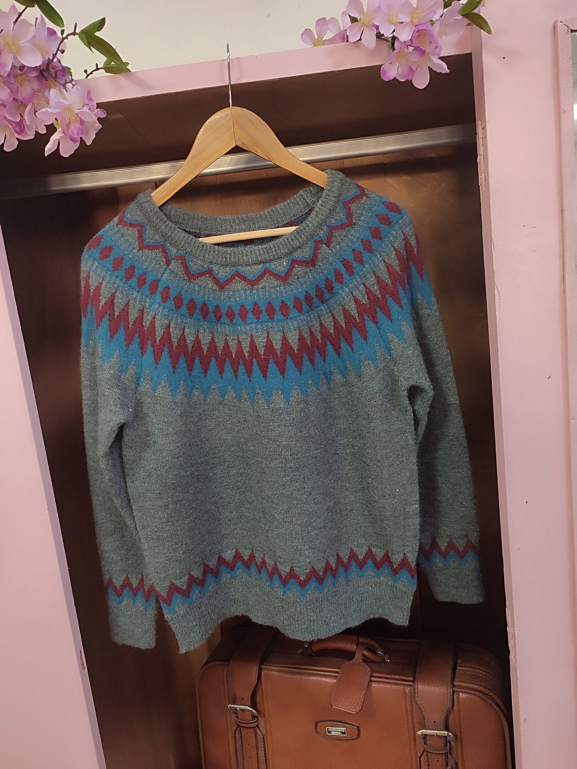 Jersey con tejido suave y diseño geometico en la parte superior. Cuello redondo y manga larga. Bordes de las mangas canalados. Úsalo solo o combínalo con camisa debajo.