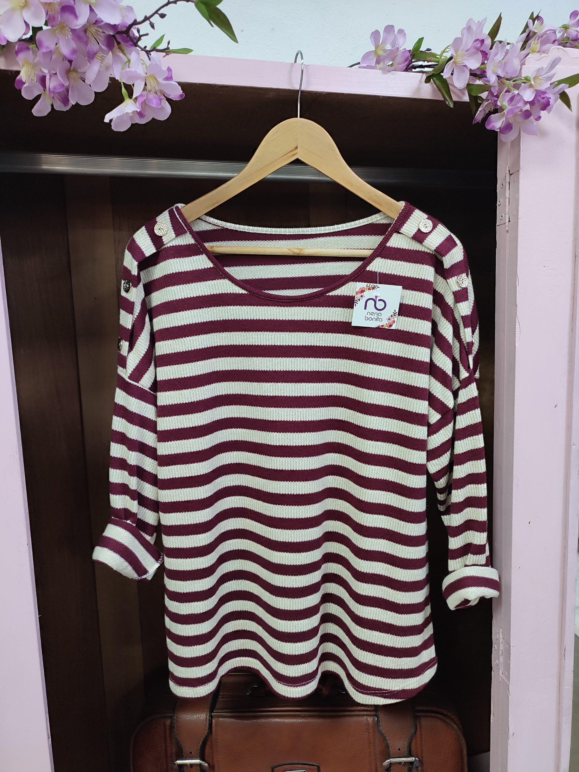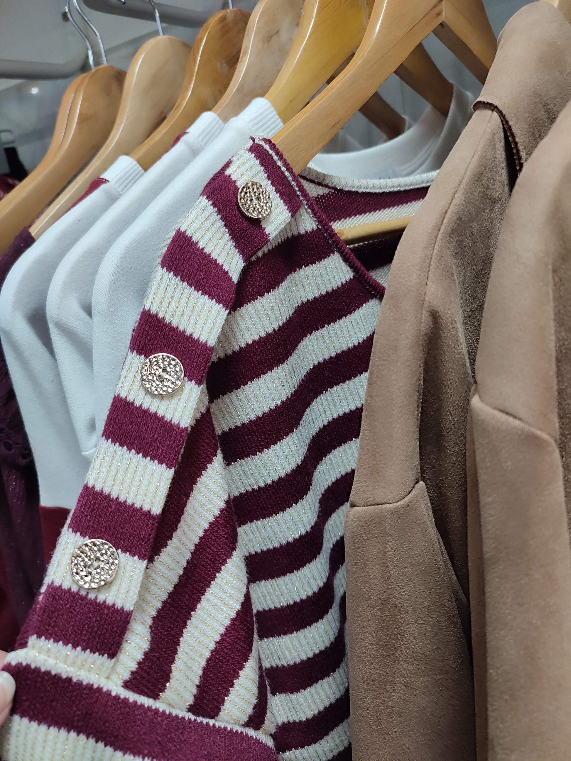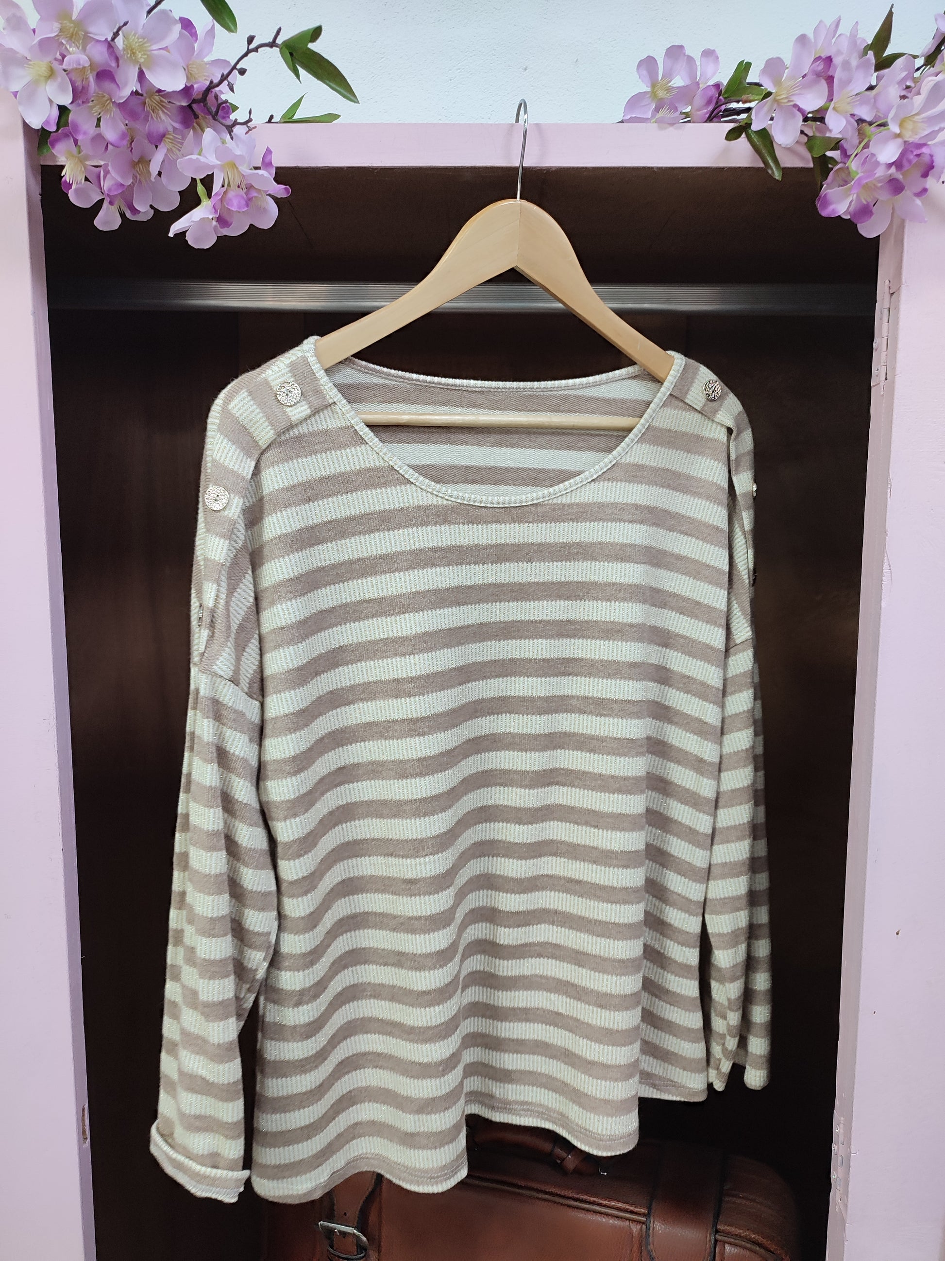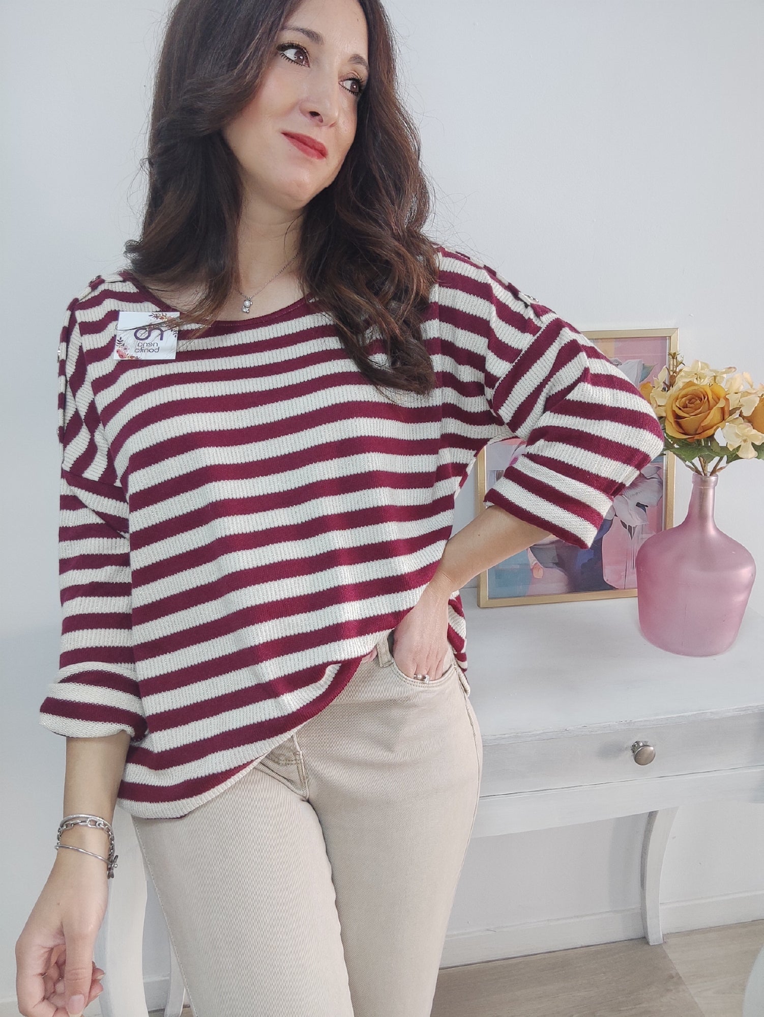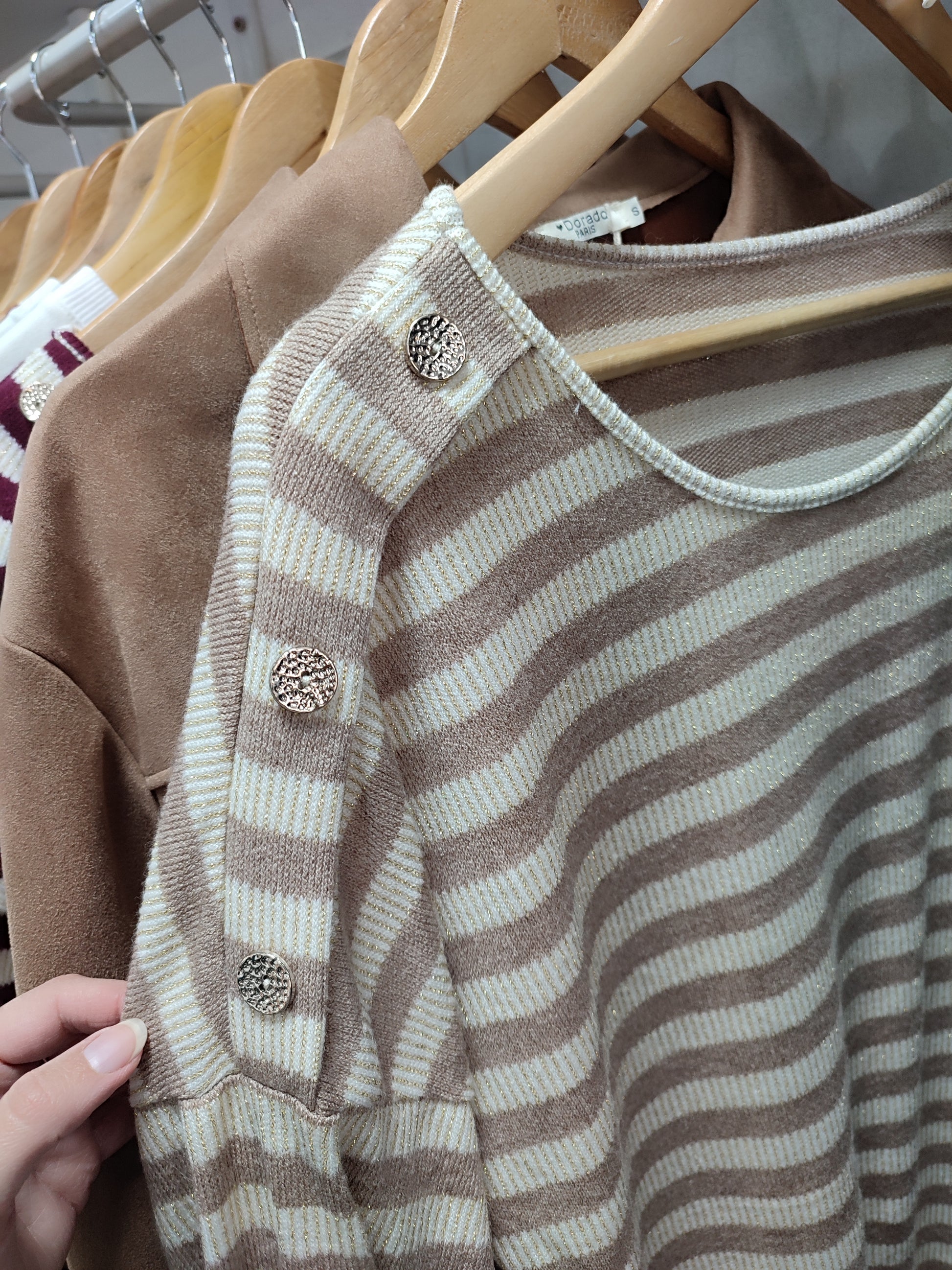 Jersey de punto a rayas con hilo dorado fino y botones en los hombros dorados.