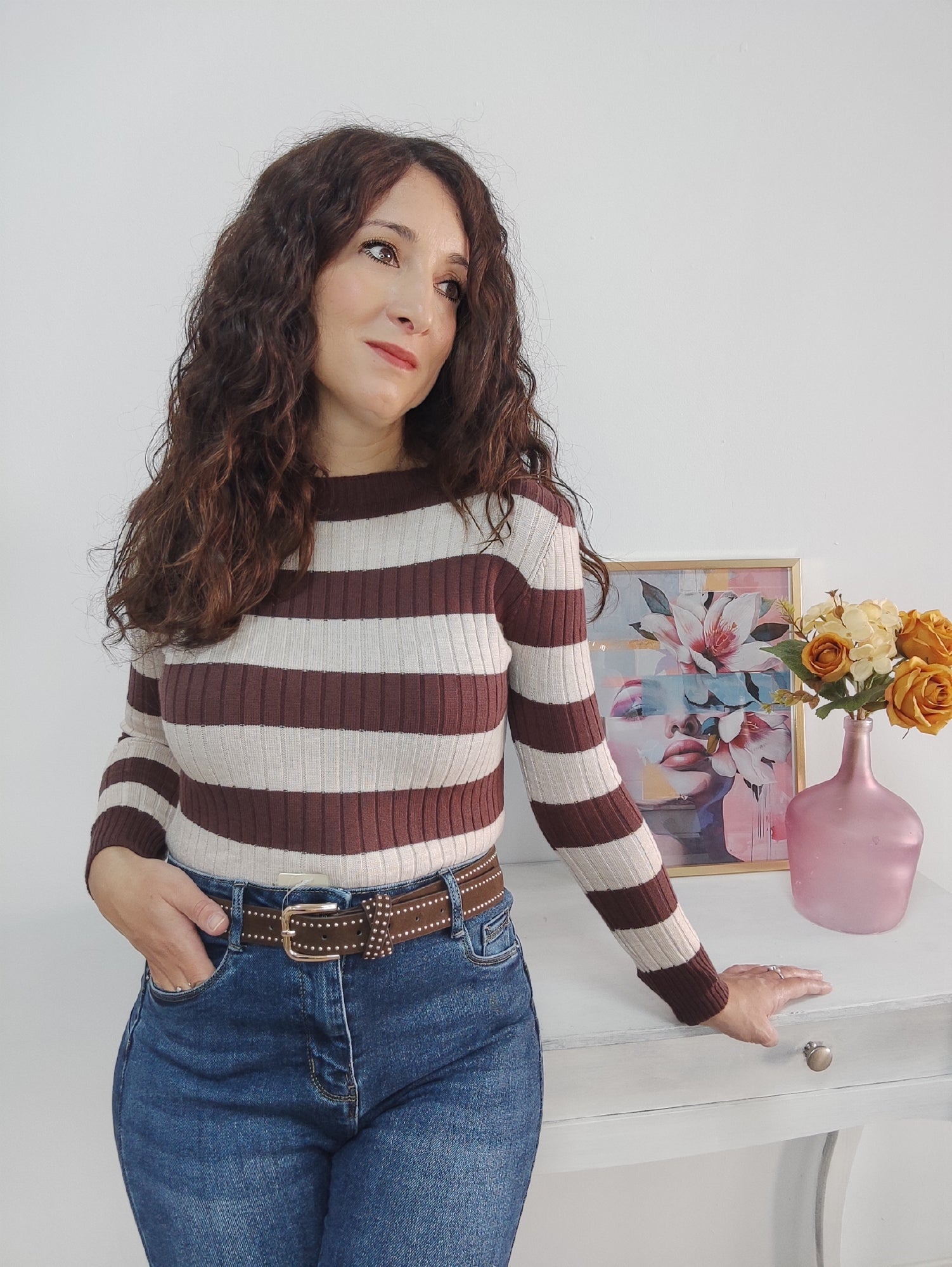 Jersey de punto fino con rayas en tono marrón chocolate. Es talla única ideal desde S hasta L