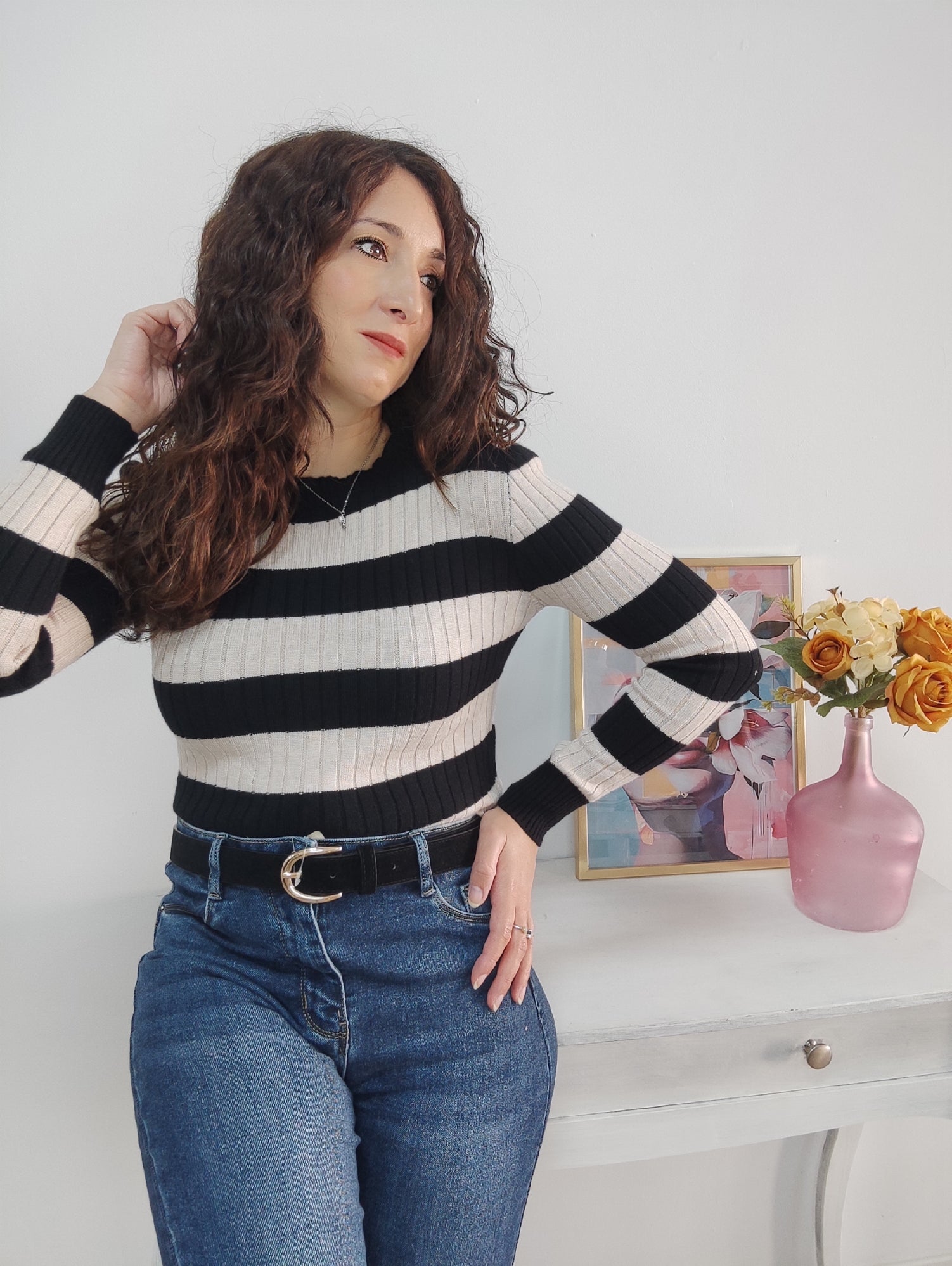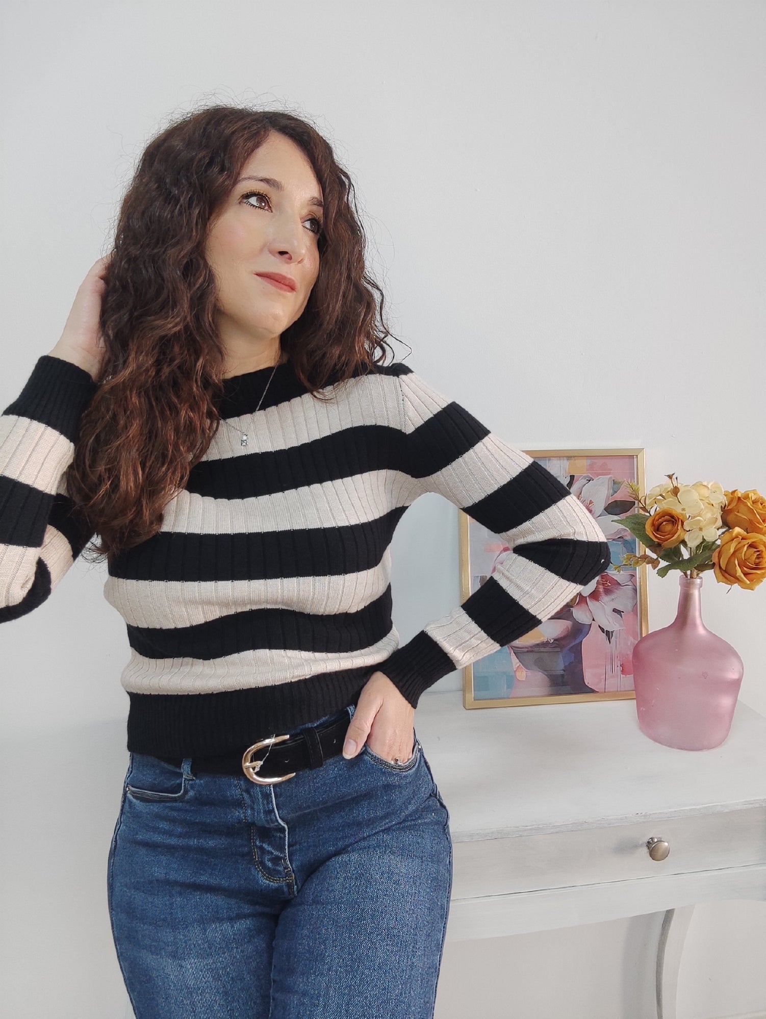 Jersey de punto fino con rayas en tono negro. Es talla única ideal desde S hasta L