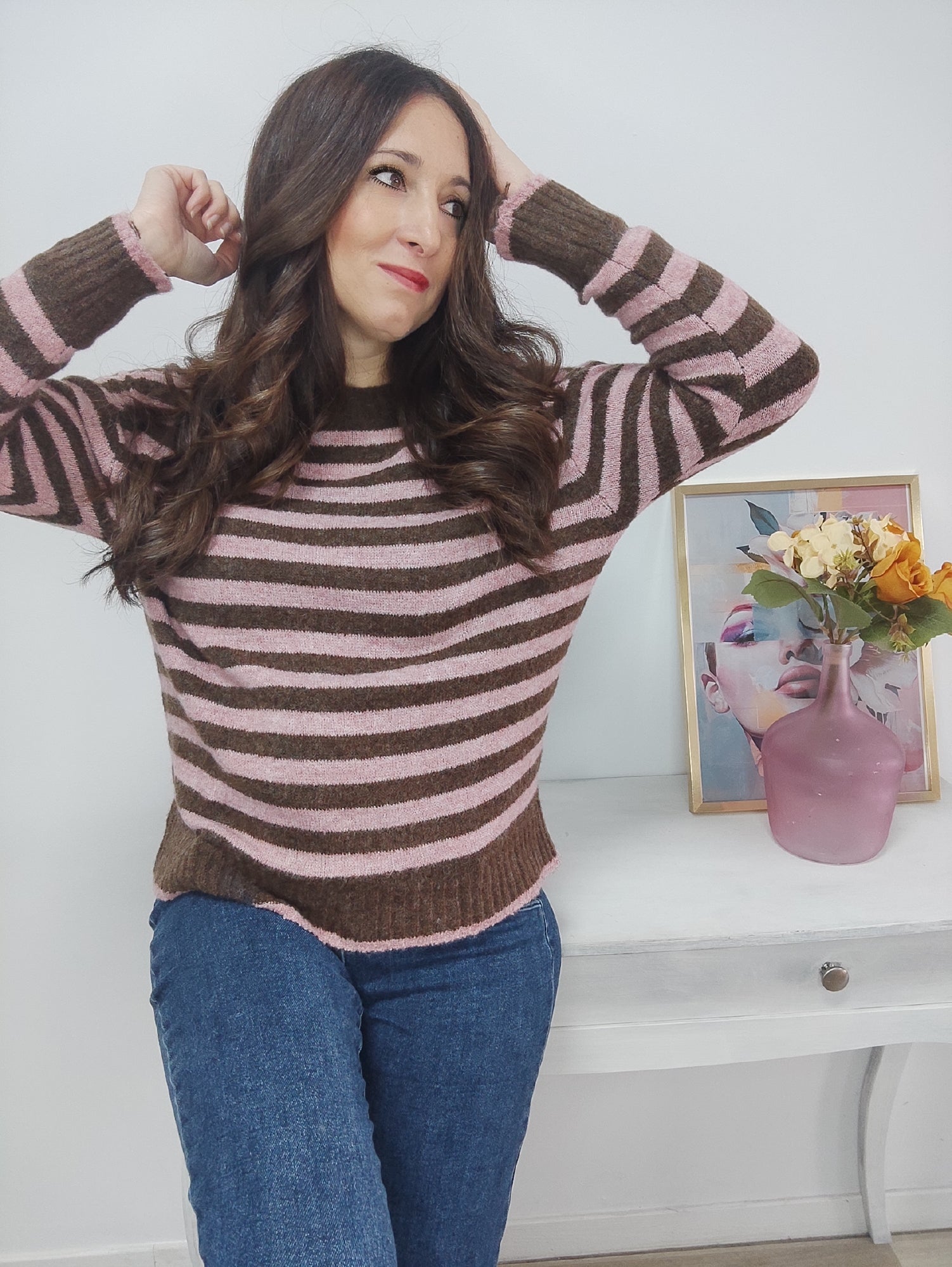 Jersey a rayas combinadas con chocolate y rosa. Tejido muy gustoso y se adapta genial.