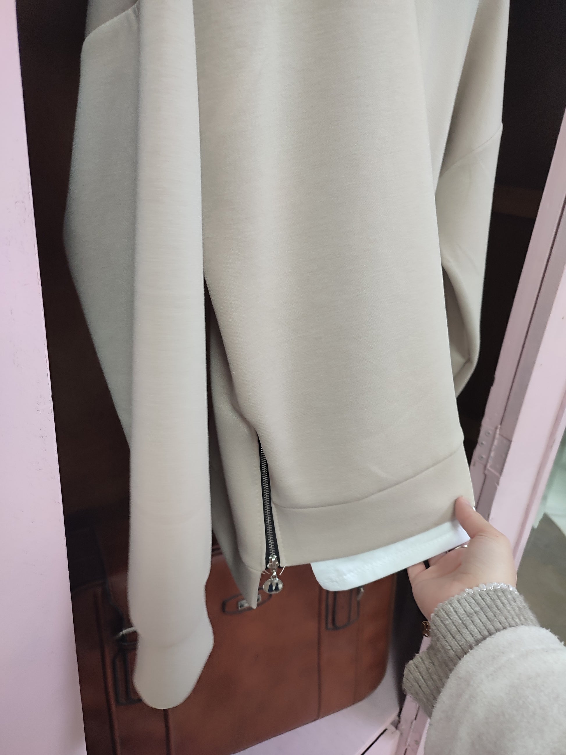 Sudadera talla única color beige con cremallera lateral y camisa superpuesta en el bajo.