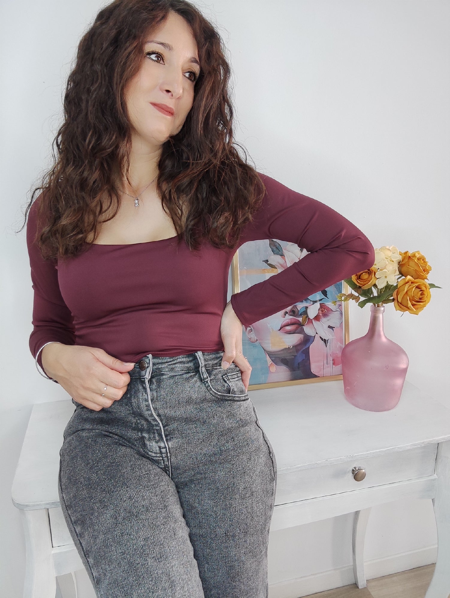Top de licra suave en manga larga. Es de color burdeos el color de tendencia de Otoño 2025.