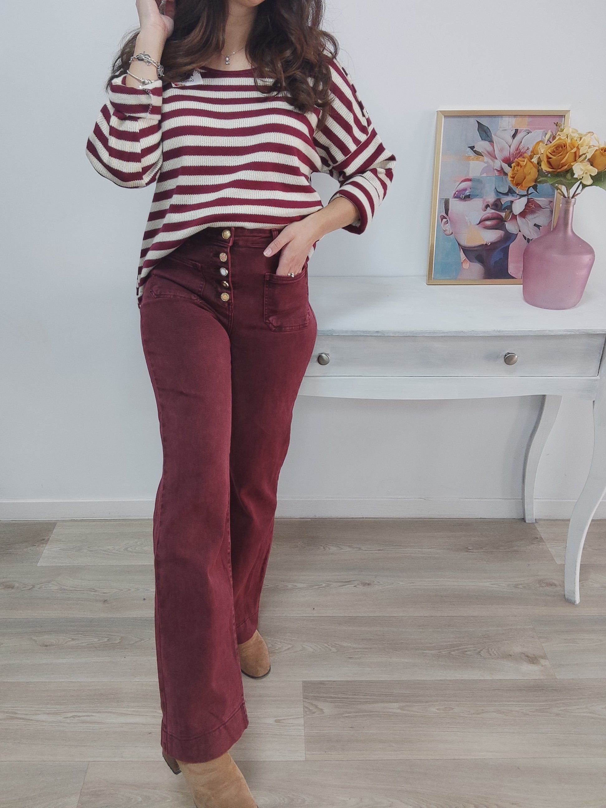 Pantalón vaquero corte wide leg con 5 botones con diseño dorado. Tiene un color burdeos muy bonito y de tendencia. Renueva tu armario con este bonito pantalón.